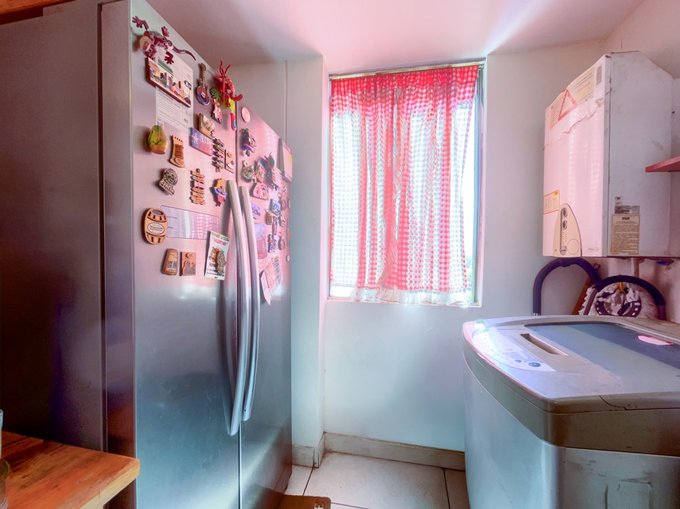 - Cocina cerrada, con artefactos empotrados, cocina a gas, lavaplatos doble y espacio originalmente pensado para desayunador o comedor de diario, actualmente utilizado para refrigerador side by side. Instalación para lavadora y calefont automático