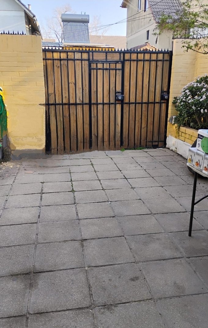 Patio trasero con espacio para 1 auto o camioneta y jardineras de ladrillo.