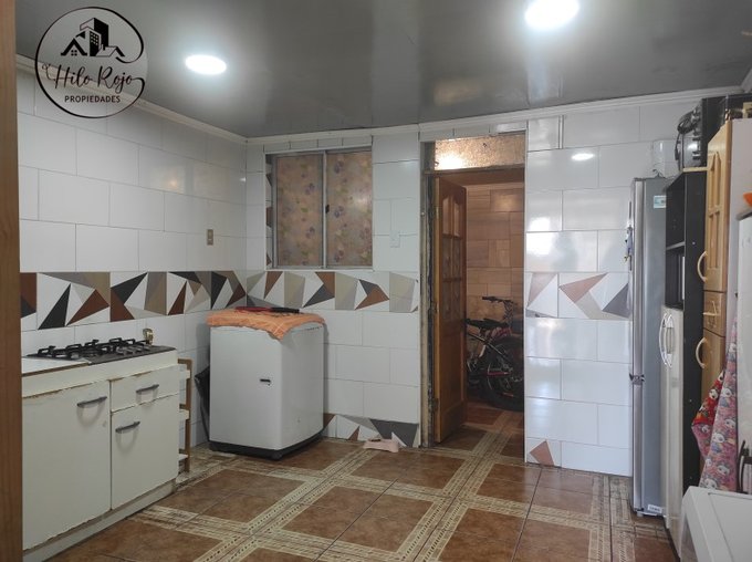 Amplia cocina con espacio y conexiones para lavadora, refrigerador y otros artefactos eléctricos.