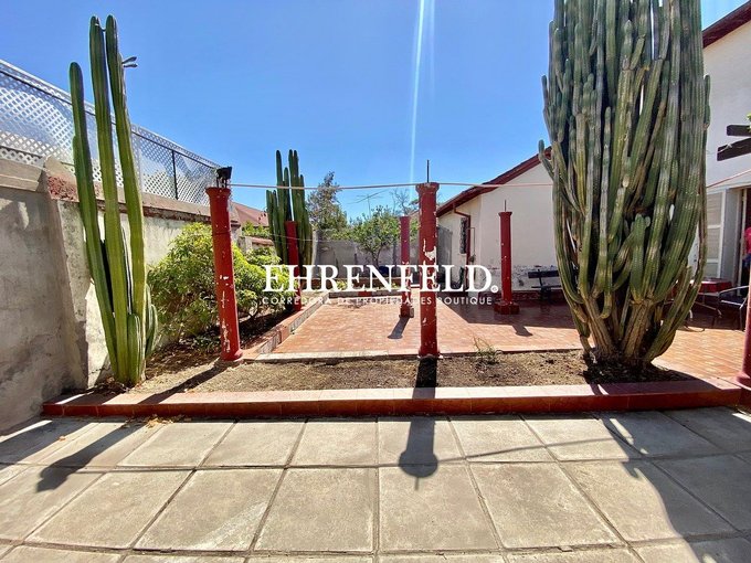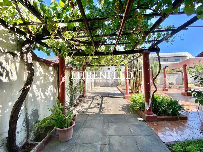 Amplia casa, de dos pisos, jardín exterior y patio interior con pilares de cemento y jardineras de cemento.