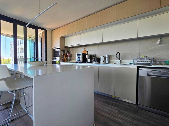 Cocina Integrada: con comedor de diario tipo isla, con encimera vitrocerámica de 4 platos, horno eléctrico empotrado, campana eléctrica con extractor, lavaplatos con doble resumidero y espacio para refrigerador de 2 puertas.