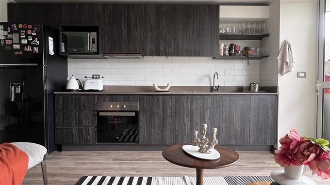Cocina integrada de estilo moderno con logia.