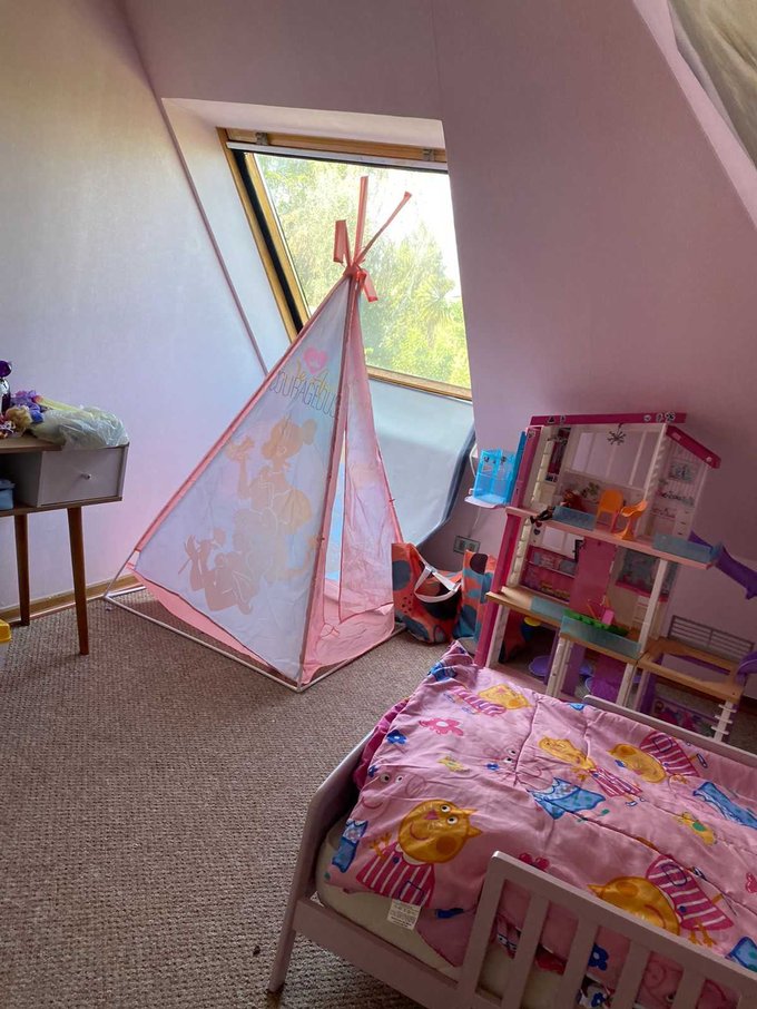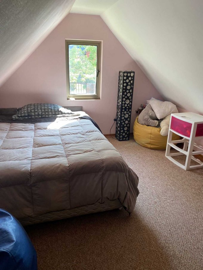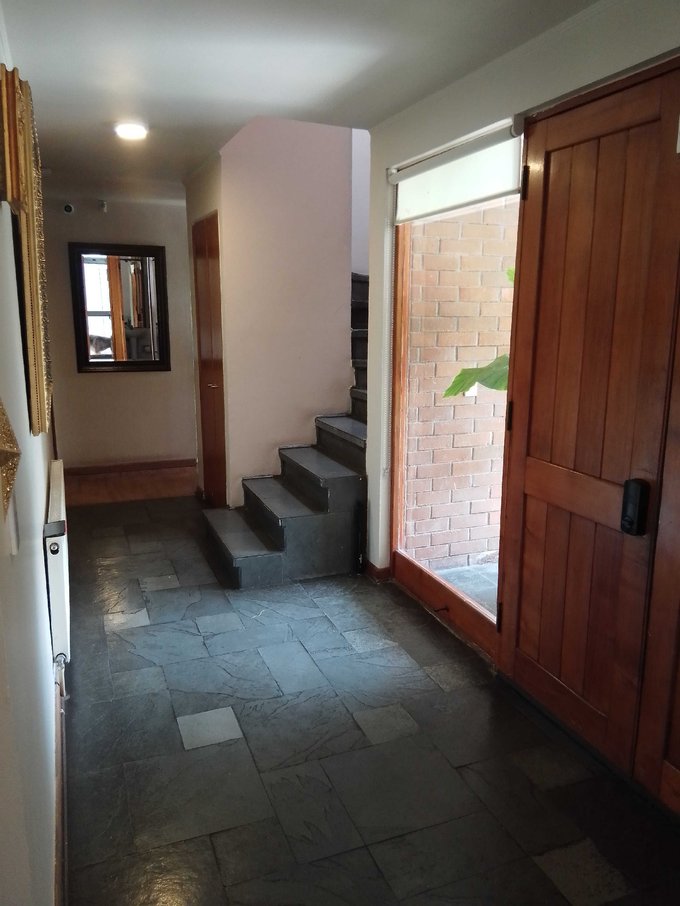 La casa de dos pisos tiene 5 dormitorios, gran sala de estar, 2 baños completos, baño de visitas y servicios completos.