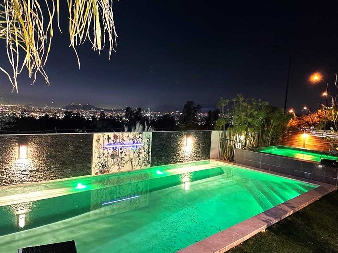 Exterior con hermosa piscina iluminada y jacuzzi con agua temperada para noches románticas o con amigos, bellos jardines, bodega y estacionamiento para 5 autos.