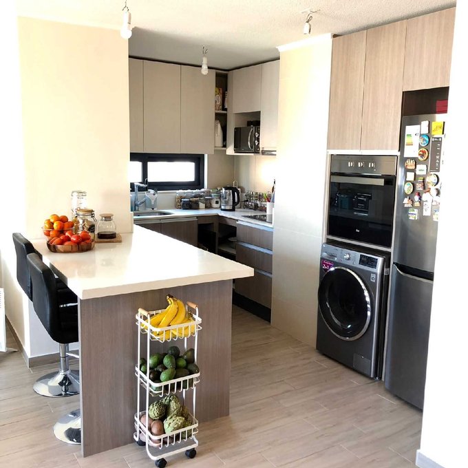 Cocina americana, equipada con horno, encimera y campana.