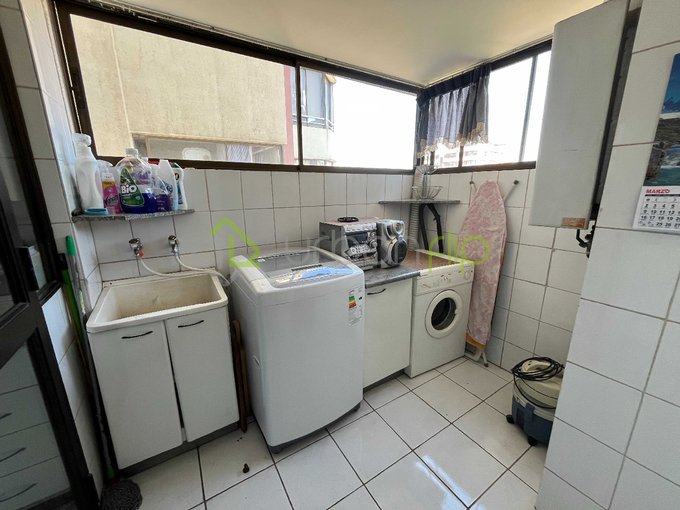 La cocina está equipada con muebles de almacenamiento, encimeras de granito y electrodomésticos, además de una logia independiente con espacio para lavadora y secadora.