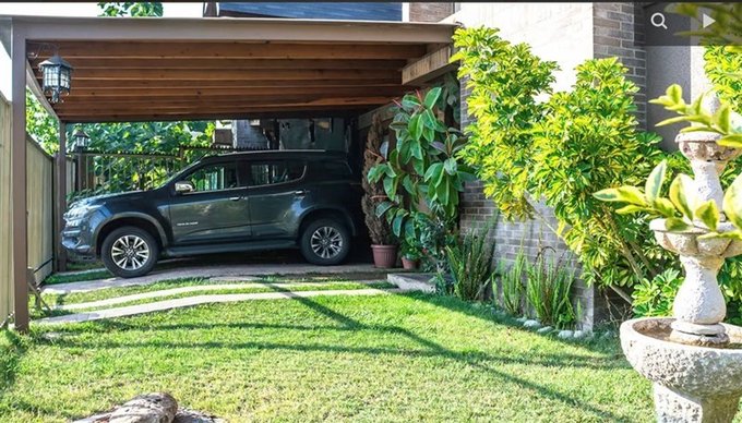 Cobertizo delantero con estacionamiento para dos vehículos.