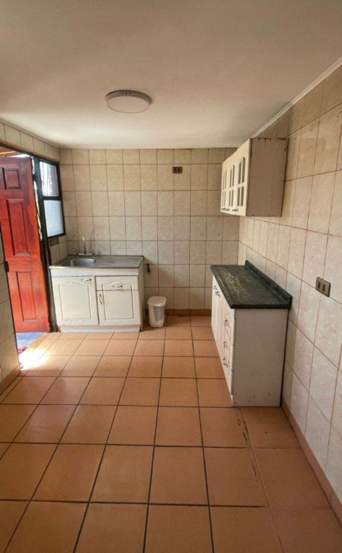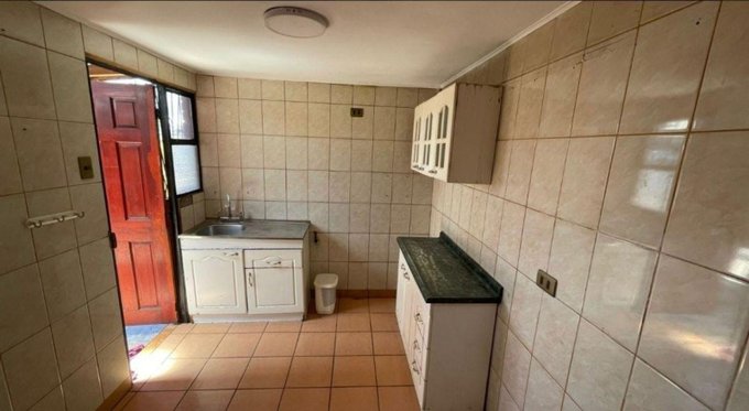 Cocina amoblada con piso y muros de cerámica.
