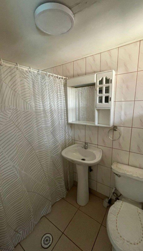 Baño completo con piso y muros de cerámica.