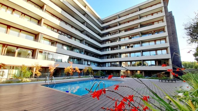 Edificio de elegante arquitectura y terminaciones cuenta con seguridad 24/7, piscina climatizada, gimnasio, salas multiuso, estacionamiento de bicicletas, amplios jardines y gran terraza con vista panorámica al lago.