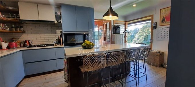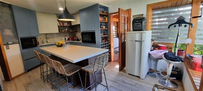 Cocina renovada con vista al jardín, moderna isla central tipo comedor de diario, despensa y bodega techada.