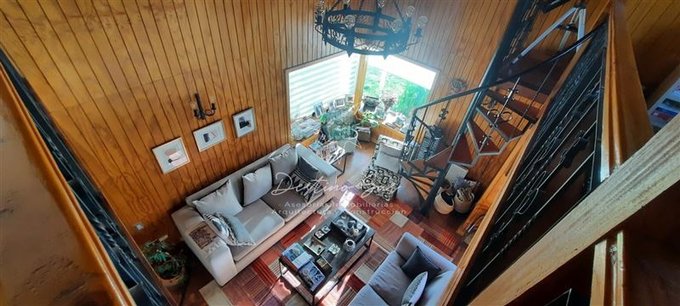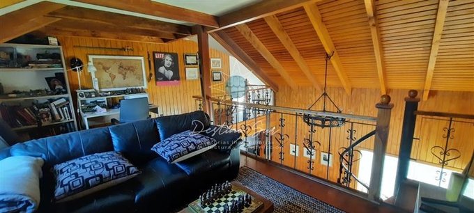 En el segundo nivel, una sala de estar contemporánea con vista panorámica a la ciudad y al living del primer piso, conectada por dos escaleras independientes.