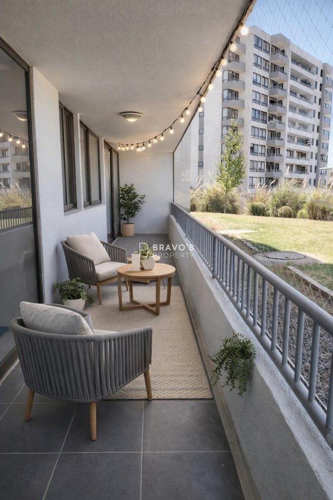 El condominio ofrece conserjería 24/7 con cámaras, piscina al aire libre, quinchos, sala multiuso, gimnasio equipado y amplias áreas verdes, todo muy bien mantenido. Pet friendly.