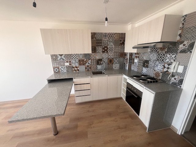 Cocina equipada con campana, horno y encimera eléctrica