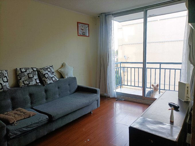 - Living comedor con salida a balcón, con vista hacia el interior del condominio.