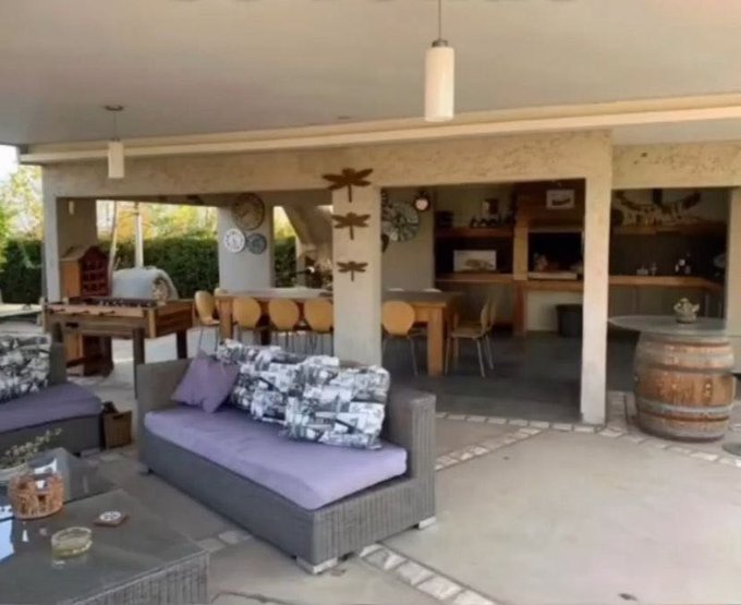 Terraza techada con salida desde el living, con hermosa vista a la piscina y Jardín y quincho.