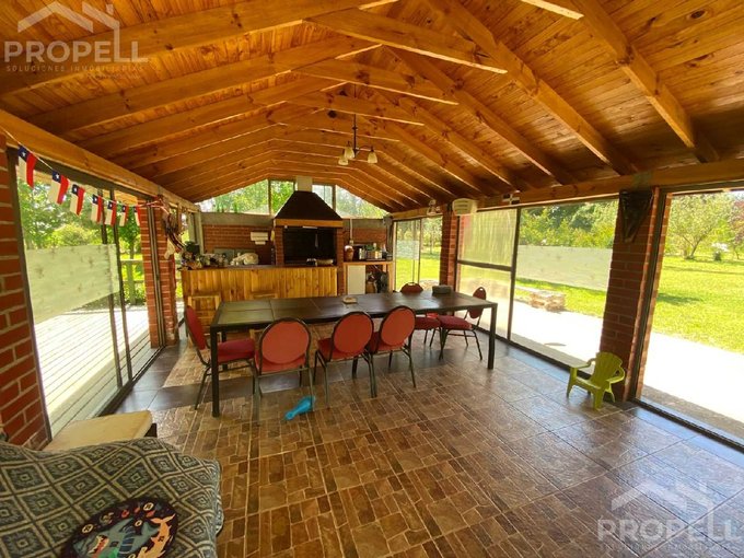 Quincho cerrado con ventanales, bosca, bar y mesón.