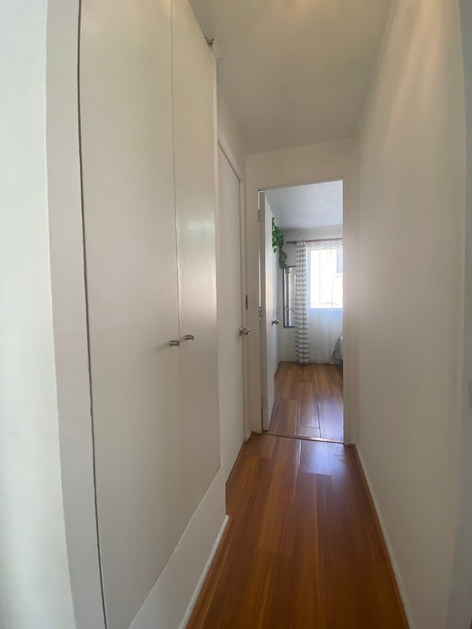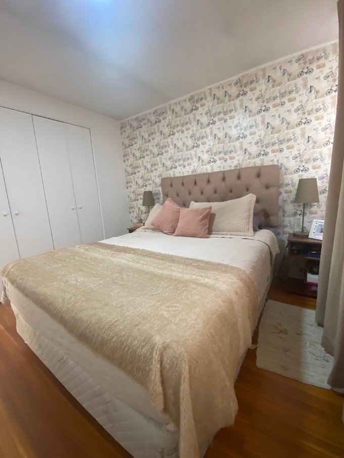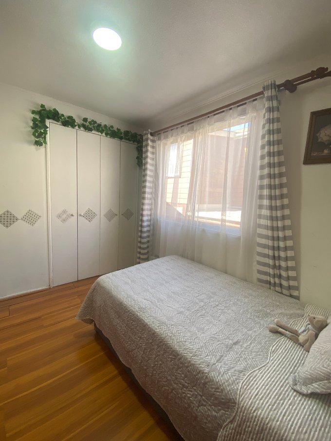 - Pequeño, cama de 1 plaza, closet en pasillo, piso flotante.