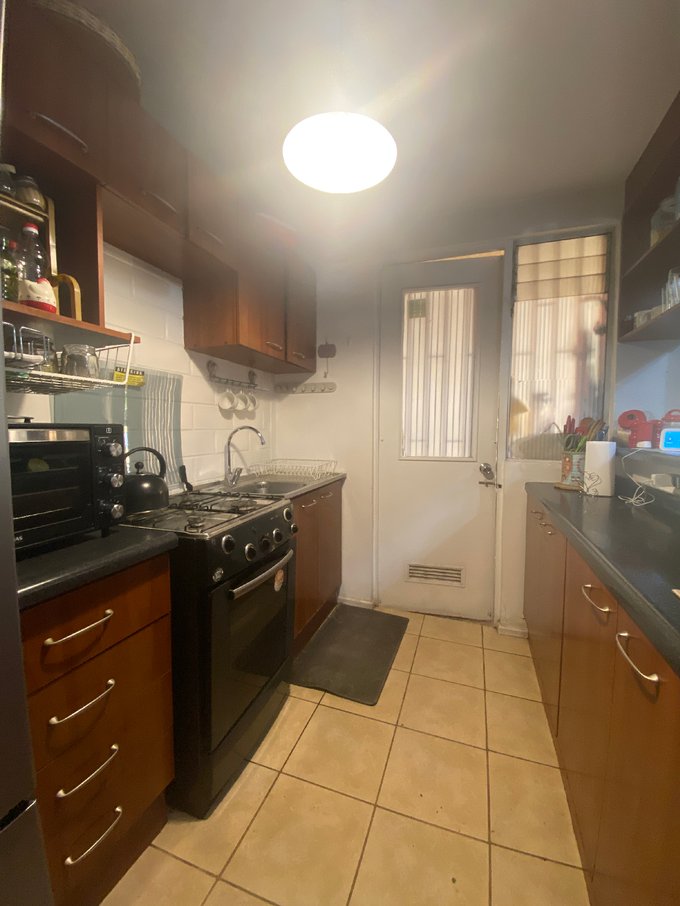 Amplio living comedor separados, piso cerámico, ventanales aluminio, cocina americana, piso cerámico, amoblada, lavaplatos de acero inoxidable, gas por cañería Metro Gas.