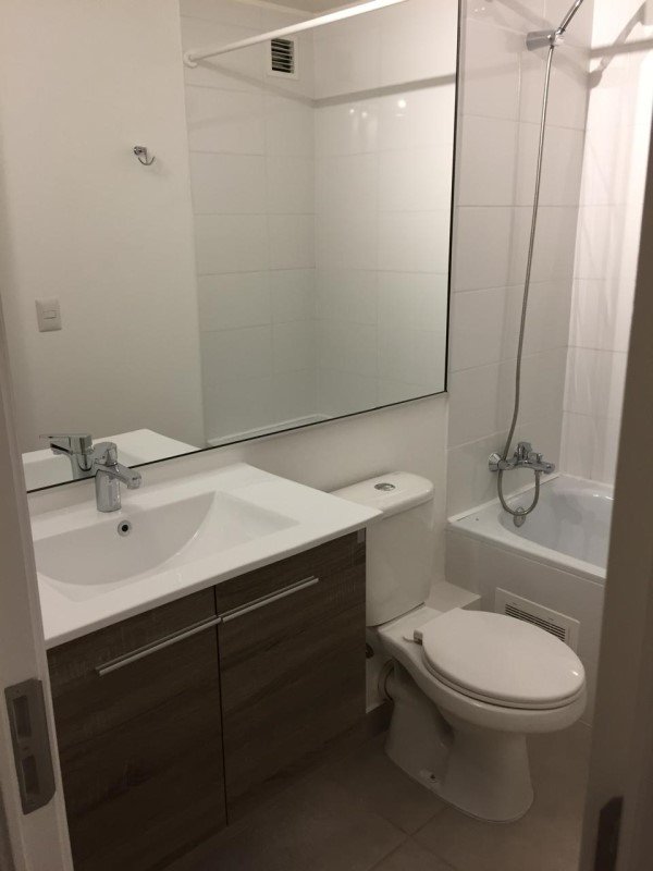 Este precioso departamento con un estilo moderno, goza de un baño de buen tamaño, con tina y gran espejo de medio cuerpo.