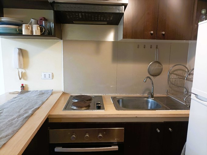 - Cocina americana amoblada con encimera, horno empotrado, campana, todo eléctrico.
