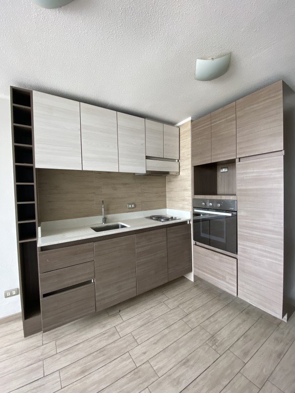 Cocina tipo Office, amoblada y equipada con horno, encimera y campana eléctrica.