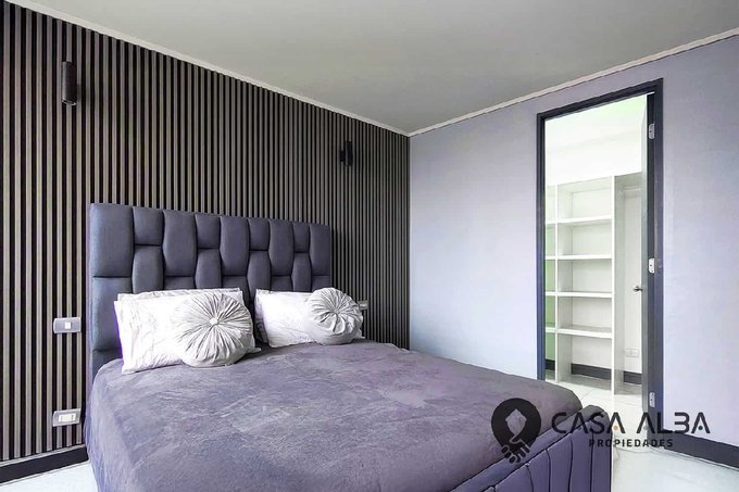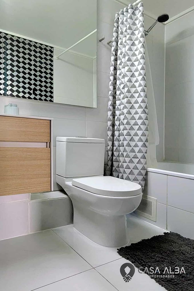 El recorrido desde el living continúa hacia la zona de descanso, donde un pasillo conecta con las dos habitaciones. El dormitorio secundario con dos closets pequeños tiene el tamaño perfecto para cama de plaza y media y otros mobiliarios, como un tocador o escritorio, y precede al amplio dormitorio principal, donde destaca un comodísimo walk-in closet para organizar todo a tu medida. El baño, ubicado en el pasillo junto a las dos habitaciones, cuenta con tina y sistema de extractor.