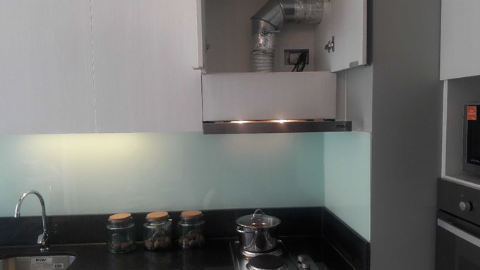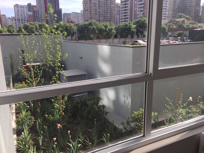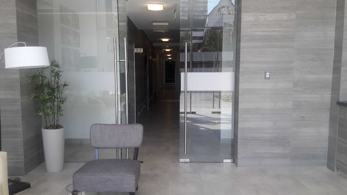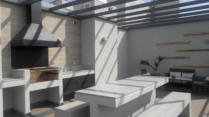 Departamento de dos ambientes con balcón, de 1 dormitorio y 1 baño. Cocina equipada, con cubierta de granito y muro de vidrio retro pintado, amoblada y equipada con encimera y horno eléctricos, campana extrahible de acero inoxidable con extracción forzada. Baño con mueble de mármol reconstituido y muros de cerámica; espacio para instalar lavadora. Ventanas de PVC con termo panel y barandas en terraza con vidrios templados.