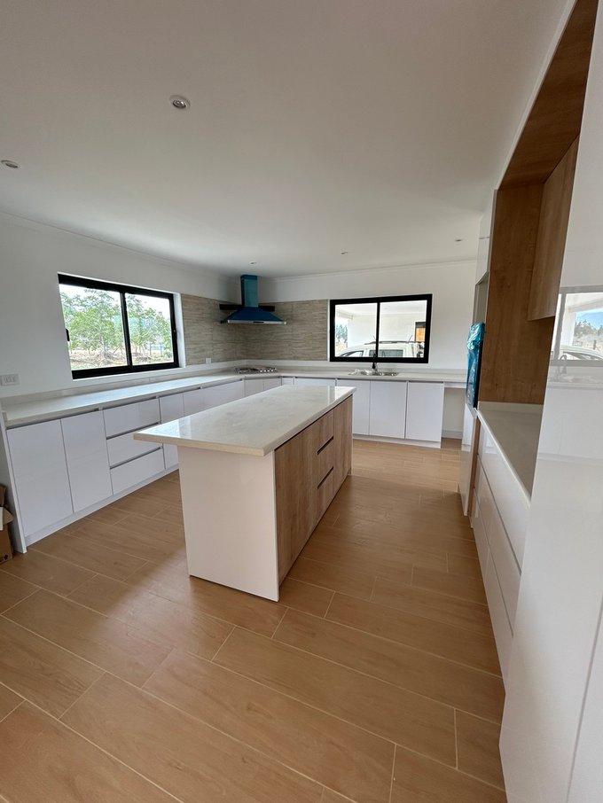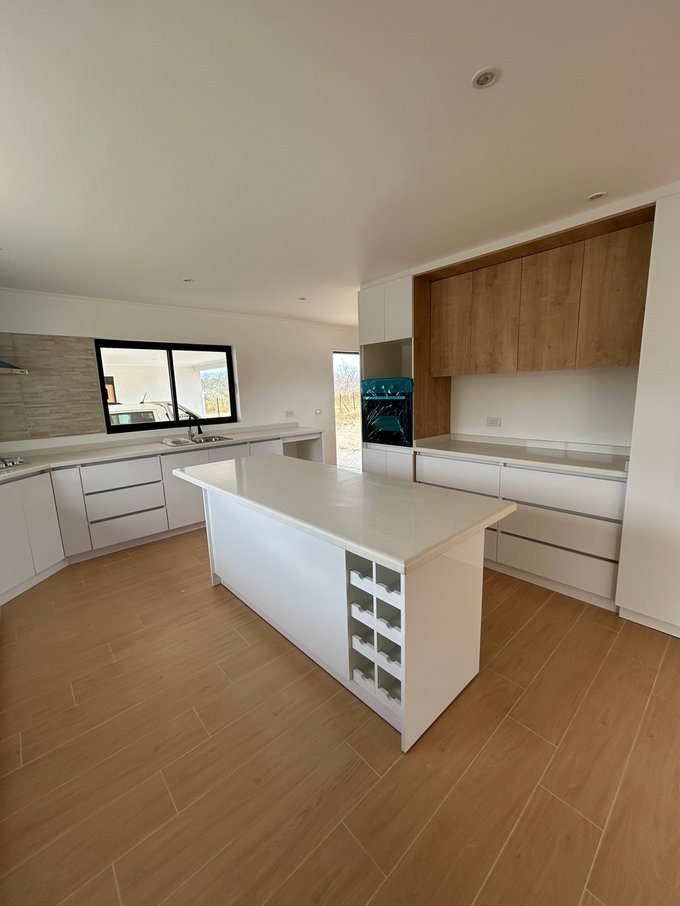 Casa sólida, con tejas asfálticas, tiene 4 dormitorios, 3 baños. De ellos, uno en suite con walk-in closet, otra pieza independiente de la casa principal, al lado del estacionamiento, que puede ser bodega, dormitorio de visita, oficina, estudio o servicio, con su propio baño. Medio baño para visitas. Baños con cerámicos en pisos y muros, con vanitorios Stretto. Estacionamiento techado para 2 vehículos, lavadero, amplia cocina americana con mesa isla con ruedas y artefactos (horno empotrado, encimera, campana FDV de Kitchen Center), muebles, despensa, etc. Dormitorios y living comedor con salida a la terraza. Pisos cerámicos Terraza de 5 x 6 metros. 2 calefonts. Tiene pozo y bomba de agua. Gas de balón de 45k, no incluye balón.
