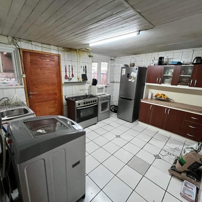 Casa de un piso con una cocina amplia ,patio, reja perimetral con entrada de vehiculo en un barrio residencial.
