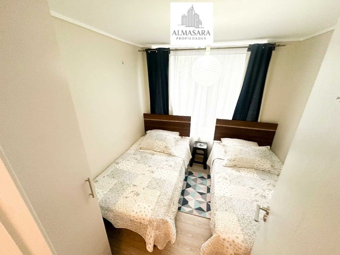 Se Vende totalmente amoblado: cama de 2 plazas, 2 camas de 1 plaza, veladores, futón, sillón individual y puf, mesa y 4 sillas tipo taburete, sistema de cortinas instalado.