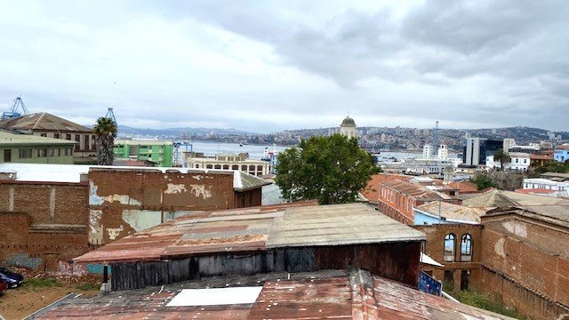 Terraza sobre el edificio con gran vista al mar y cerros.