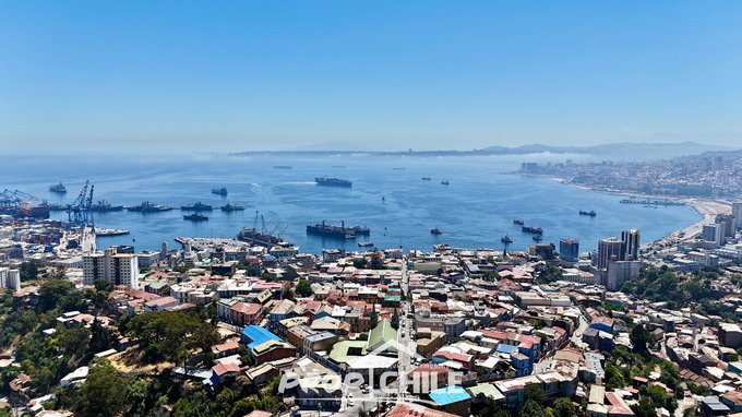 Espectacular terraza con vistas panorámicas a la bahía de Valparaíso, dividida en dos áreas por un bar central.