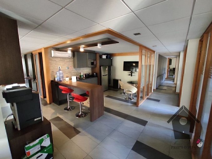 Una arquitectura interior dominada por divisiones en madera y cristal otorga la adecuada separación y privacidad entre los distintos ambientes, sin cortar el flujo de la luz natural que ingresa por las ventanas. La instalación tiene pisos revestidos con cerámica en pasillos y oficinas y alfombra en algunas oficinas, pisos de cerámica en zonas húmedas, cielo americano y aire acondicionado en algunas áreas.