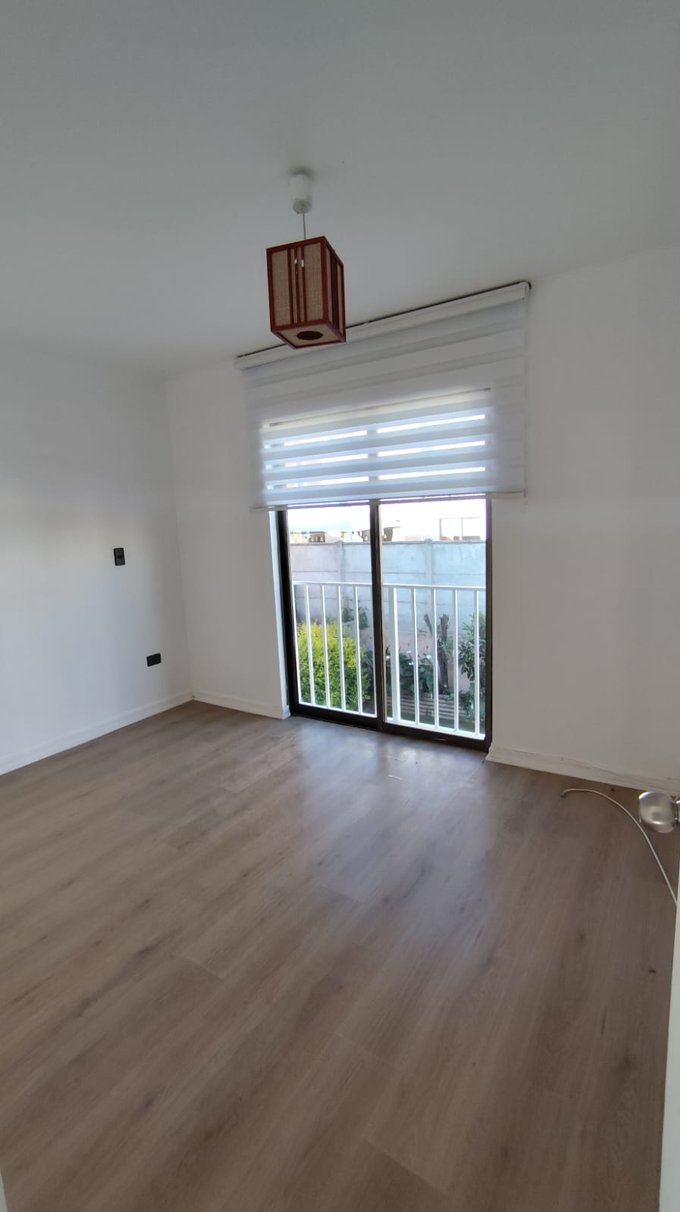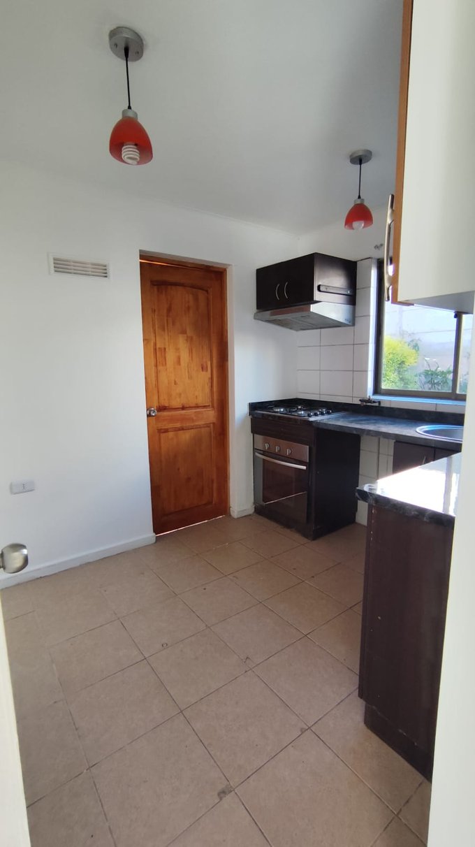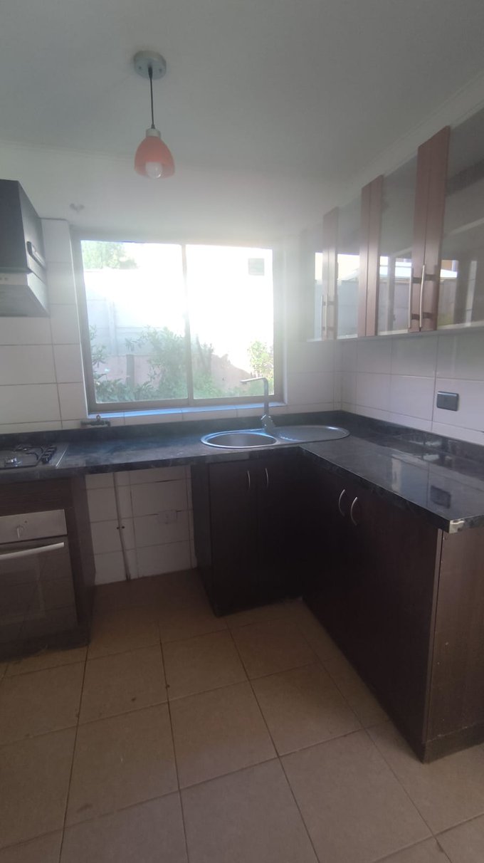 La cocina es de estilo tradicional, con muebles base y aéreos en tono oscuro, cubierta de granito y amplio ventanal que entrega buena luz natural. Incluye campana y espacio para instalación de horno empotrado y cocina encimera. El jardín trasero dispone de un área verde delimitada, con arbustos y plantas en los costados, entregando privacidad y un entorno agradable.