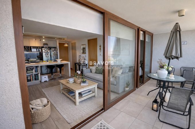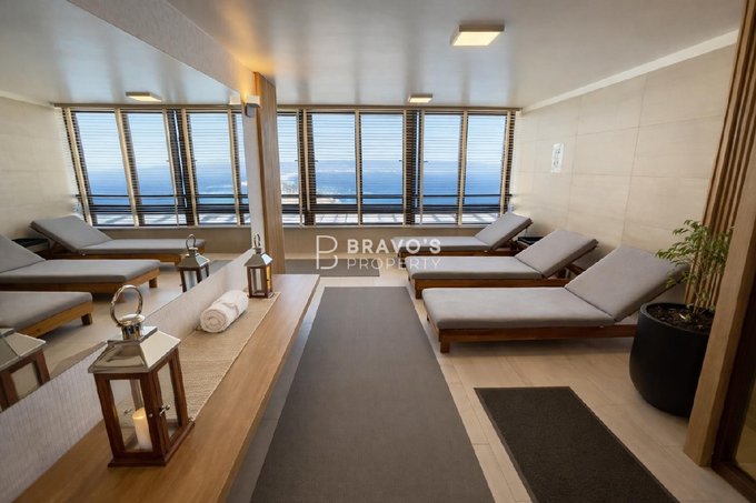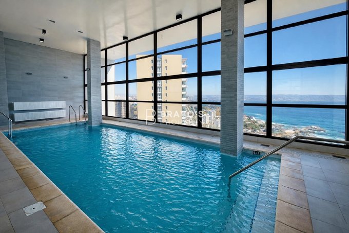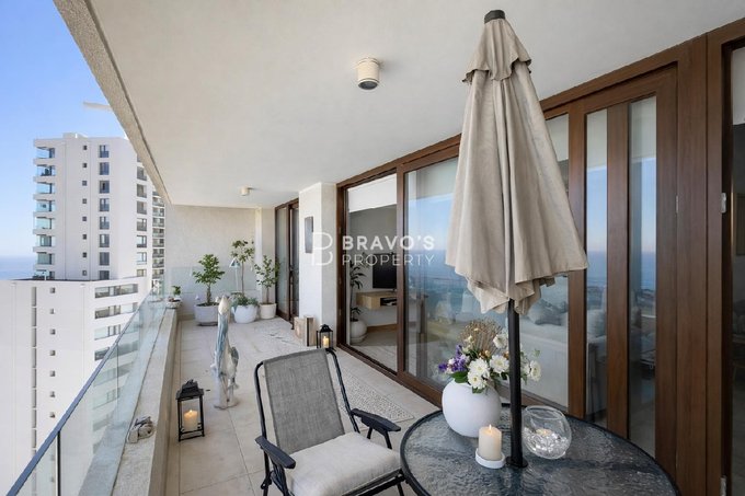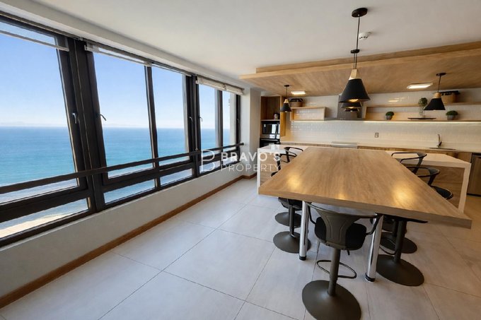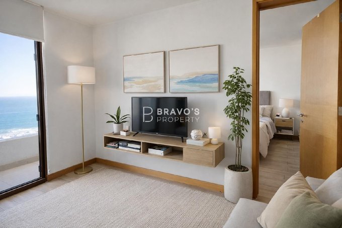 Cuenta con 2 dormitorios en suite, cocina americana integrada y una amplia terraza con vista totalmente despejada al océano. Superficie total: 76,97 m (aprox. 14 m de terraza). Piso 22 en edificio moderno del año 2021. Incluye estacionamiento y bodega. Acepta mascotas.