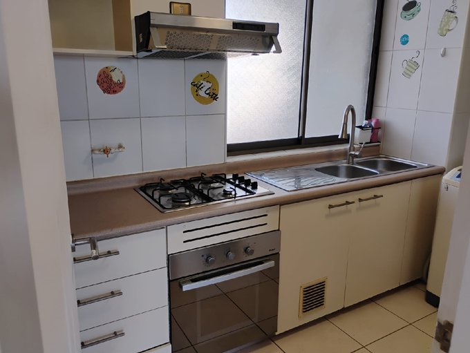 * Cocina tradicional totalmente equipada con horno, campana y cocina encimera, muebles con bastante capacidad de almacenamiento, espacio para lavadora y para refrigerador grande.