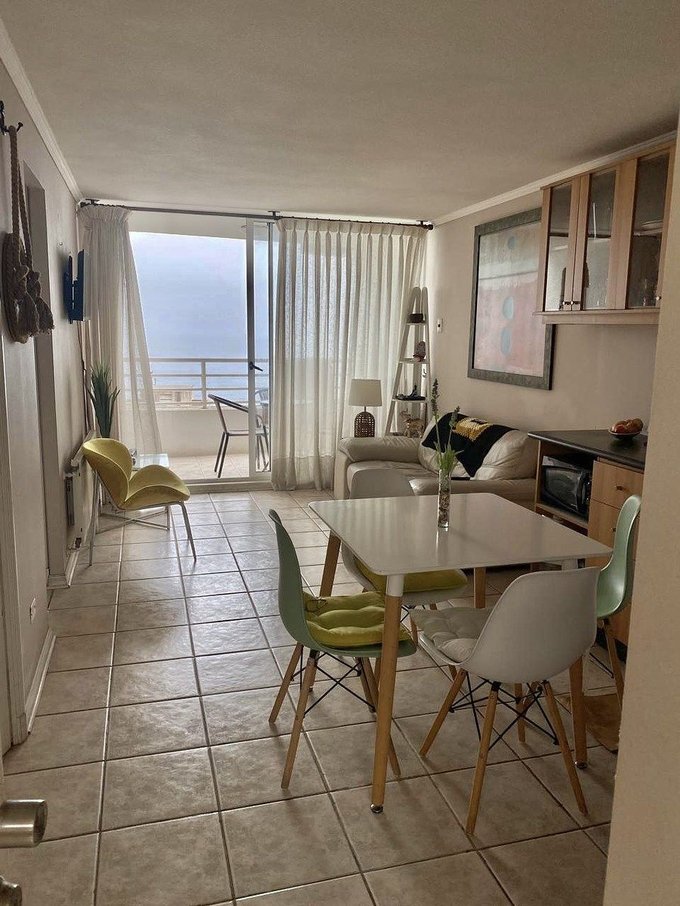 Departamento con vista al mar orientación poniente, en Las Perlas, Cochoa, Viña del Mar, recién reacondicionado. Tiene living comedor con cocina americana y terraza, dos dormitorio con baño . Un estacionamiento y bodega