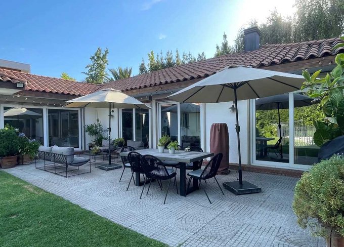 En el exterior, la casa dispone de un amplio jardín con áreas verdes y piscina, ideal para disfrutar al aire libre. Destaca una terraza techada y un quincho, pensados para reuniones y momentos de esparcimiento, complementados con mobiliario exterior y detalles en madera. La propiedad incorpora dos bodegas, ofreciendo espacio adicional de almacenamiento.