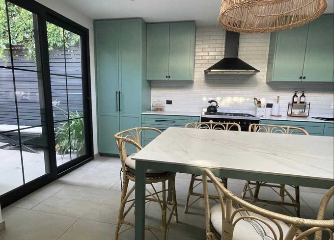 El diseño interior considera ambientes diferenciados para sala de estar, escritorio y dormitorios, todos con ventanas al exterior y terminaciones en madera. Los baños están completamente equipados, con lavamanos dobles y detalles en cerámica. La cocina se conecta directamente con el jardín, integrando de forma natural los espacios interiores y exteriores.